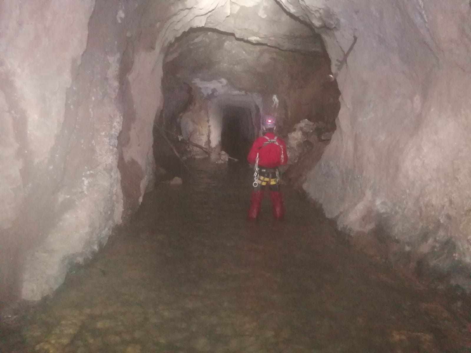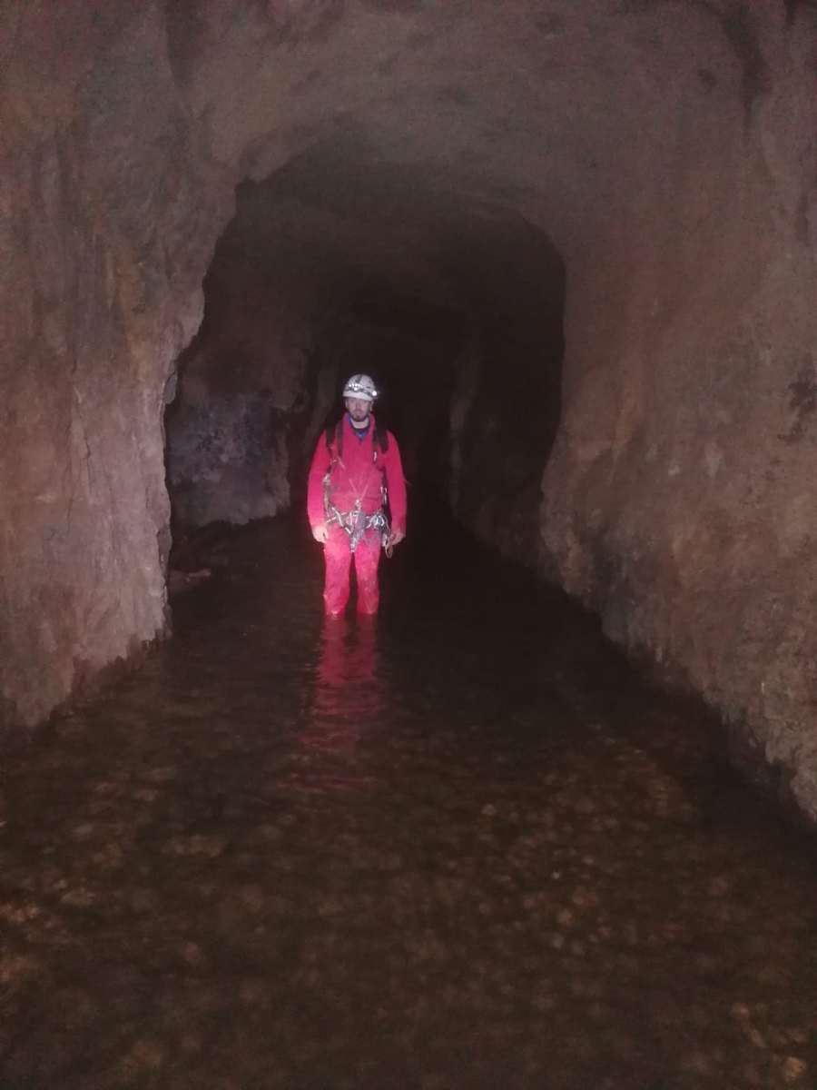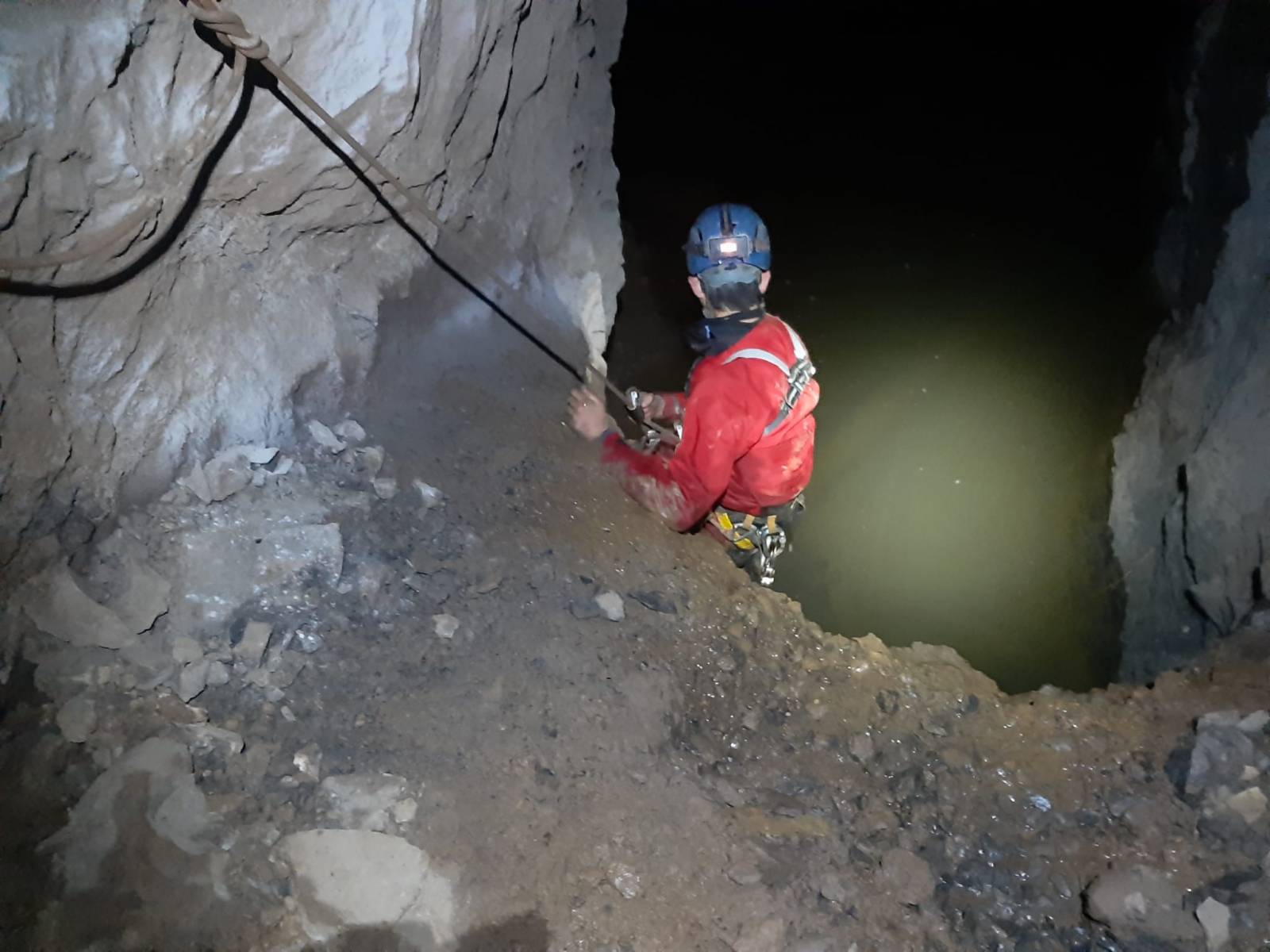 Una vez en la sima, B baja instalando la cuerda. En varios casos necesita limpiar los spit viejos con macho de roscar para instalar el anclaje. Una vez los tres abajo, visitamos la sala y el río del fondo. Hoy el río baja normal, pero parece que ha habido una crecida de unos 3 metros en fechas recientes. Visitamos el vivac del BetiGoruntz.
